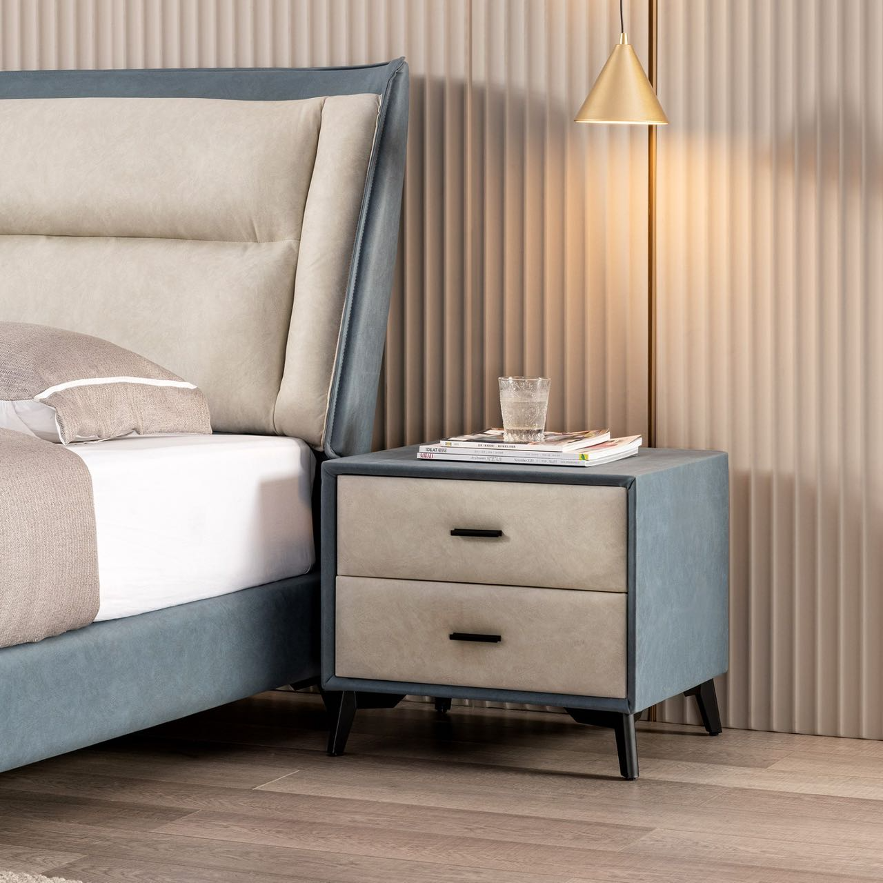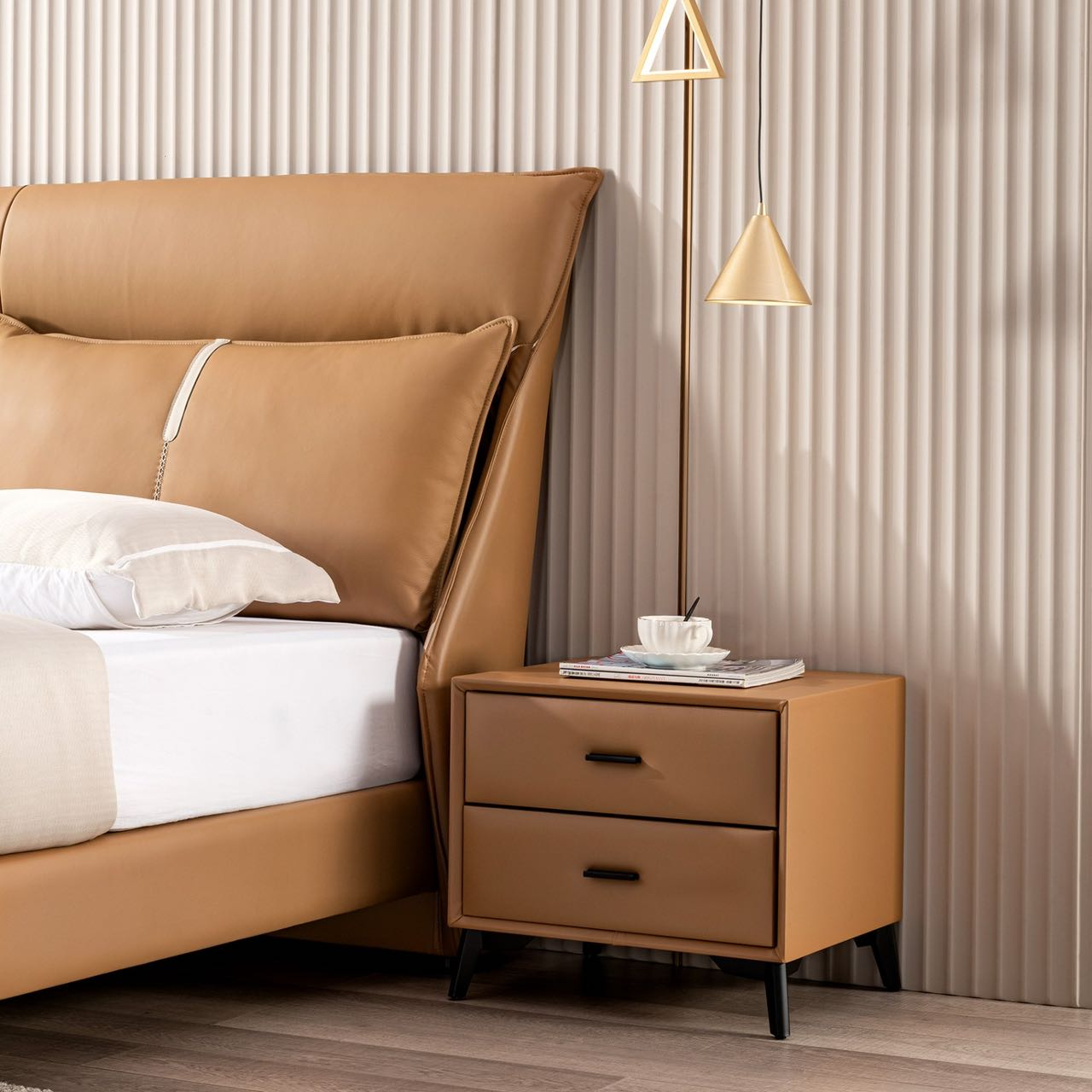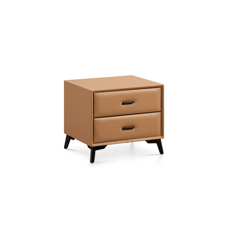 The Arezzo side table brings a touch of refined craftsmanship and unique design to any bedroom. Its sleek minimalist style, featuring solid wood drawer fronts and premium leather accents, exudes sophistication. Perfectly adaptable, it enhances the ambiance of any home setting. Experience luxury and functionality with this exquisite piece.