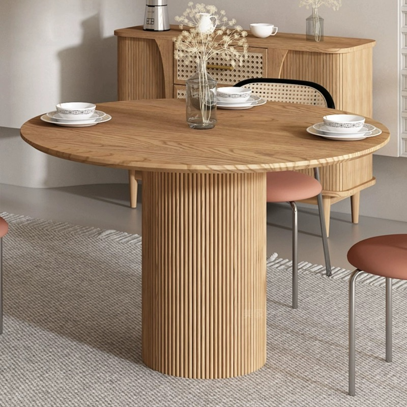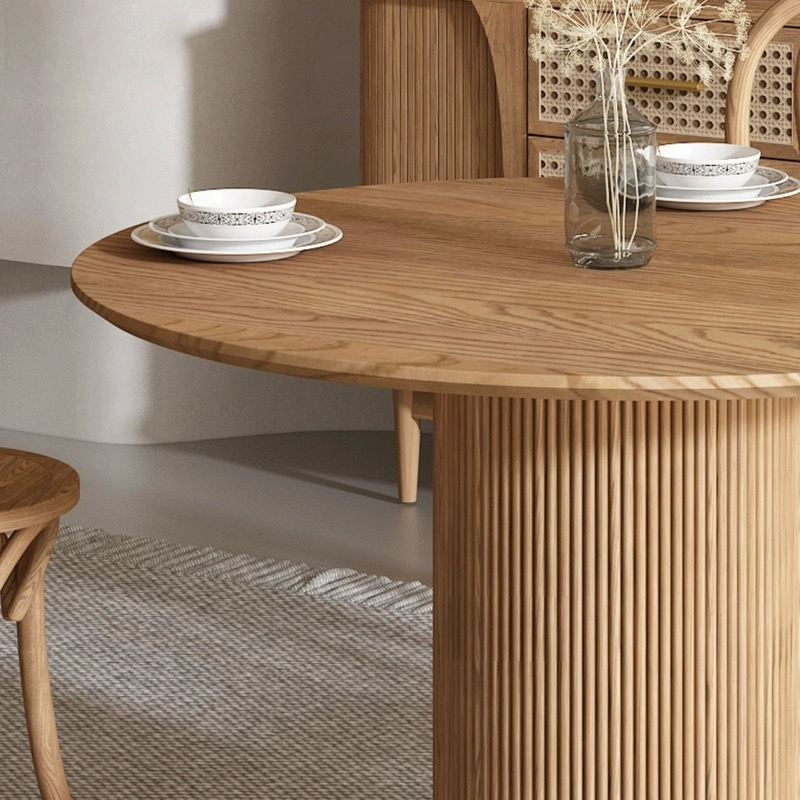 Embrace the serene elegance of the Fukui Dining Table, featuring a graceful Ash wood frame and a beautifully textured wood grain surface. This table embodies the simplicity and refinement of Japanese design, with its smooth, circular shape and natural materials creating a tranquil dining experience. The Ash wood frame adds a touch of warmth, while the wood grain surface enhances its timeless appeal. Perfect for both modern and traditional interiors, this dining table offers a harmonious blend of style and functionality, making it an ideal centerpiece for your dining area.