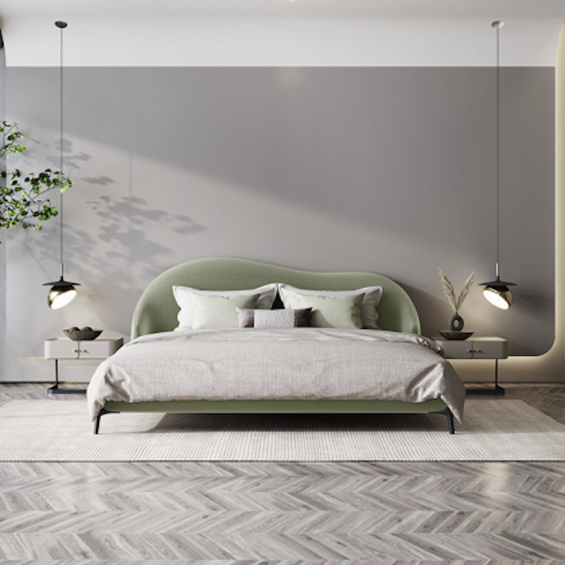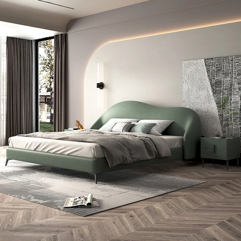 The Irene bed epitomizes minimalist elegance with its unique wave-like headboard and luxurious materials. Choose between top-grain calf leather or high-end velvet for a sumptuous finish, enhanced by high-density sponge for optimal comfort. The imported larch wood frame ensures lasting support and stability. This bed transforms your bedroom into a serene and sophisticated retreat. Elevate your space with the Irene bed’s refined design and luxurious feel. Available in King or Queen sizes, please consider mattress sizing before ordering.
