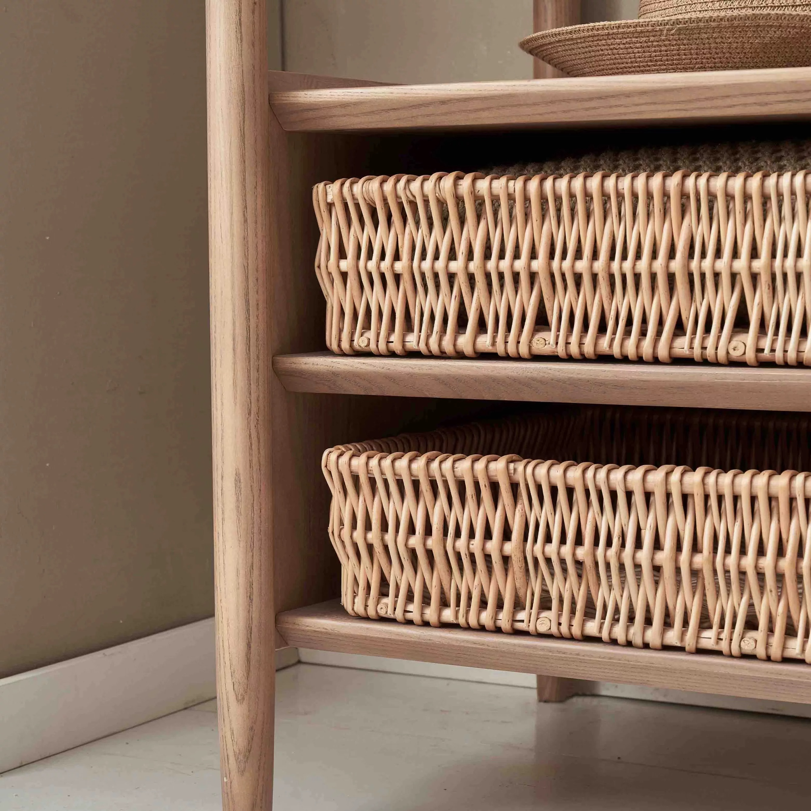 The Kai Closet Shelving Unit is a testament to minimalist Japanese design, combining the natural beauty of solid ash wood with the artisanal touch of real rattan weaving. Its unique, vacation-inspired look brings a sense of calm and sophistication to any room. This table’s clean, simple lines and elegant materials offer a perfect complement to modern and serene interiors. Experience the subtle luxury of the Kai in your own home.